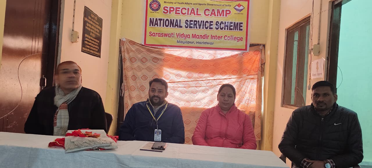 आज दिनांक 1 जनवरी सन 2026 को सरस्वती विद्या मंदिर इंटर कॉलेज मायापुर हरिद्वार की राष्ट्रीय सेवा योजना इकाई का विशेष शिविर प्रारंभ हुआ कार्यक्रम का शुभारंभ मां शारदे के समक्ष दीप प्रज्वलित करके किया गया आज के कार्यक्रम में मुख्य अतिथि के रूप में इंडियन बैंक के मैनेजर श्रीमान दीपक रस्तोगी जी एवं सहायक प्रबंधक पूनम चौधरी जी उपस्थित हुई विद्यालय के प्रधानाचार्य श्रीमान अजय सिंह जी ने सभी आए हुए अतिथि महोदय का स्वागत किया इंडियन बैंक के मैनेजर श्रीमान दीपक रस्तोगी जी ने सभी स्वयंसेवी भैया बहनों को बैंकिंग संबंधित जानकारियां एवं डिजिटल अवेयरनेस और साइबर फ्रॉड से बचने की जानकारियां दी गई स्वयंसेवियो द्वारा लक्ष्य गीत का आयोजन किया गयाl विद्यालय के प्रधानाचार्य श्रीमान अजय सिंह जी द्वारा सभी स्वयंसेवियों को 7 दिन तक किस प्रकार से सेवा कार्यों मैं सहयोग देना है आदि की जानकारियां दी गई एनएसएस कार्यक्रम अधिकारी श्रीमान अमरीश कुमार जी द्वारा 7 दिन तक शिविर में आयोजित की जाने वाली गतिविधियों की जानकारियां दी l सभी स्वयंसेवियों को जानकारियां दी गई कार्यक्रम में 50 स्वयंसेवी भैया बहन उपस्थित हुएl कार्यक्रम में विद्यालय के आचार्य श्रीमान अर्जुन सिंह जी हिमांशु जी अनुज जी जगपाल जी एवं श्रीमती दीपमाला जी उपस्थित हुईl