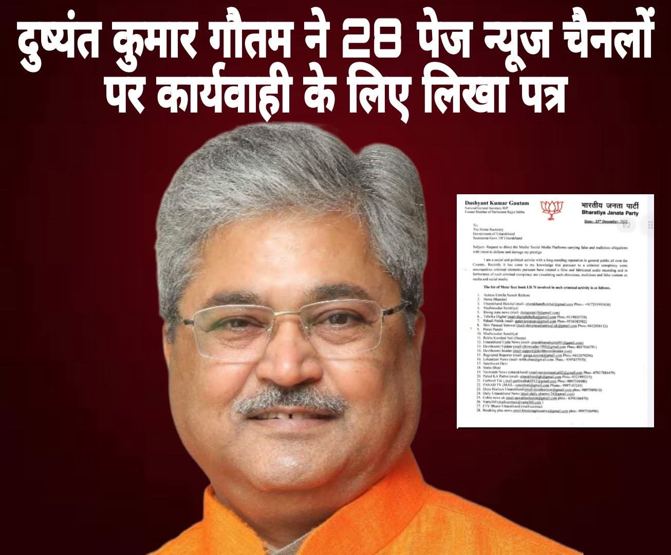 भारतीय जनता पार्टी के राष्ट्रीय महासचिव और पूर्व राज्यसभा सांसद दुष्यंत कुमार गौतम ने उत्तराखंड सरकार से सोशल मीडिया प्लेटफॉर्म्स पर चल रही कथित झूठी और भ्रामक सामग्री के खिलाफ कड़ी कार्रवाई की मांग की है। इस संबंध में उन्होंने प्रदेश के गृह सचिव को पत्र भेजकर कहा है कि कुछ असामाजिक तत्वों द्वारा एक फर्जी ऑडियो तैयार कर उनके खिलाफ दुर्भावनापूर्ण अभियान चलाया जा रहा है, जिससे उनकी छवि को नुकसान पहुंचाने का प्रयास किया जा रहा है।