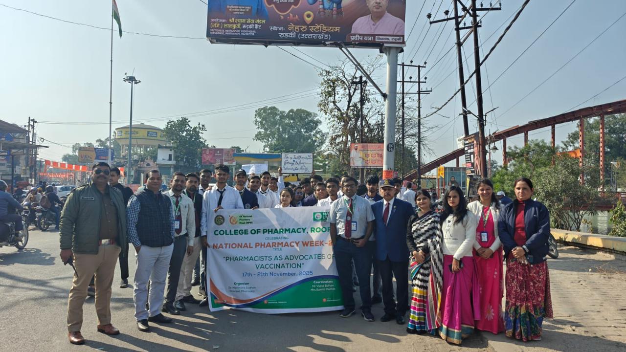 हरिद्वार यूनिवर्सिटी के फ़ार्मेसी कॉलेज में 17 नवम्बर 2025 से प्रारम्भ हुए राष्ट्रीय फ़ार्मेसी सप्ताह के अवसर पर रुड़की शहर में एक भव्य जागरूकता रैली आयोजित की गई। इस वर्ष फ़ार्मेसी सप्ताह का विषय “Pharmacists as Advocates of Vaccination” निर्धारित किया गया है, जिसका उद्देश्य समाज में टीकाकरण की आवश्यकताओं और स्वास्थ्य सेवाओं में फ़ार्मासिस्ट की महत्वपूर्ण भूमिका को रेखांकित करना है। रैली का शुभारम्भ विश्वविद्यालय के वरिष्ठ अधिकारियों