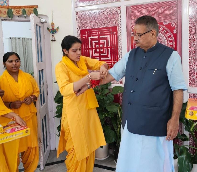 देहरादून, 09 अगस्त। रक्षाबंधन के पावन अवसर पर आज हाथीबड़कला स्थित शासकीय आवास पर कन्या गुरुकुल महाविद्यालय देहरादून की छात्राओं एवं पर्यावरण मित्र महिलाओं ने कैबिनेट मंत्री गणेश जोशी की कलाई पर रक्षा सूत्र बांधकर उनके दीर्घायु एवं सुख-समृद्धि की कामना की। इस अवसर पर कैबिनेट मंत्री गणेश जोशी ने प्रदेशवासियों को रक्षा बंधन की बधाई एवं शुभकामनाएं दी। इस दौरान मंत्री जोशी ने सभी बहनों को उपहार भेंट कर सभी का आशीर्वाद लेते हुए कहा कि “रक्षाबंधन केवल भाई-बहन के स्नेह का पर्व ही नहीं, बल्कि यह हमारे रिश्तों में विश्वास, प्रेम और सुरक्षा के संकल्प का प्रतीक है।