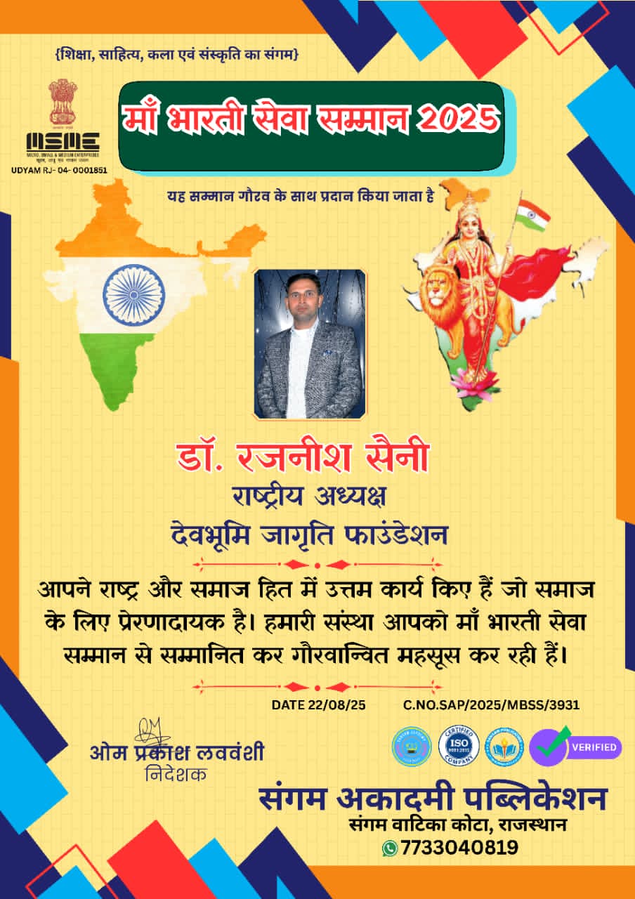 अग्रसर करने वाले वरिष्ठ समाजसेवी,शिक्षाविद,हिंदी साहित्यकार ओर देवभूमि जागृति फाउंडेशन के राष्ट्रीय अध्यक्ष डॉ रजनीश सैनी को देश सेवा में समर्पण,निश्वार्थभाव सेवा एवं कर्तव्य निष्ठा के लिए “माँ भारती सेवा सम्मान