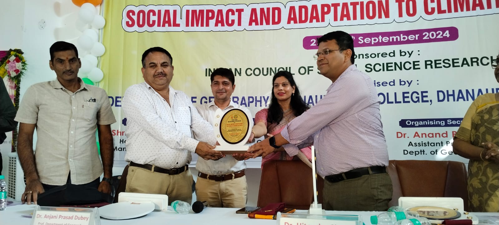 शनिवार को धनौरी पी.जी. कॉलेज में भूगोल विभाग द्वारा आयोजित समाज पर जलवायु परिवर्तन के प्रभाव पर प्रसारित राष्ट्रीय संगोष्ठी के समापन समारोह में पहुंचे मुख्य अतिथि डॉ. हितेंद्र सिंह, विशेष अतिथि प्रोफेसर अंजनी प्रसाद दुबे, प्रोफेसर नमिता जोशी, डॉ. मनोज कुमार त्रिपाठी, प्राचार्य डॉ. विजय कुमार, उप प्राचार्या डॉ. अलका सैनी और कार्यक्रम संयोजक डॉ. राहुल कुमार द्वारा संयुक्त रूप से कार्यक्रम समारोह का सुभारंभ किया गया। कार्यक्रम में पहुंचे मुख्य अतिथि डॉ. हितेंद्र सिंह ने जल की उपयोगिता के बारे में जानकारी देते हुए कहा कि पानी हमारे जीवन का एक महत्वपूर्ण बिंदु है तथा पीने योग्य पानी के पैमाने के बारे सबको पता होना आवश्यक है।उन्होंने वर्षा के जल को संरक्षित करने पर विशेष बल दिया। विशिष्ट अतिथि प्रोफेसर अंजनी प्रसाद दुबे ने कहा कि जलवायु परिवर्तन एक गंभीर चिंतन का विषय है। उन्होंने जलवायु परिवर्तन से मानव जीवन, कृषि, आर्थिक व्यवस्था पर क्या प्रभाव हो रहे हैं के बारे में भी अवगत कराया। अतिथि